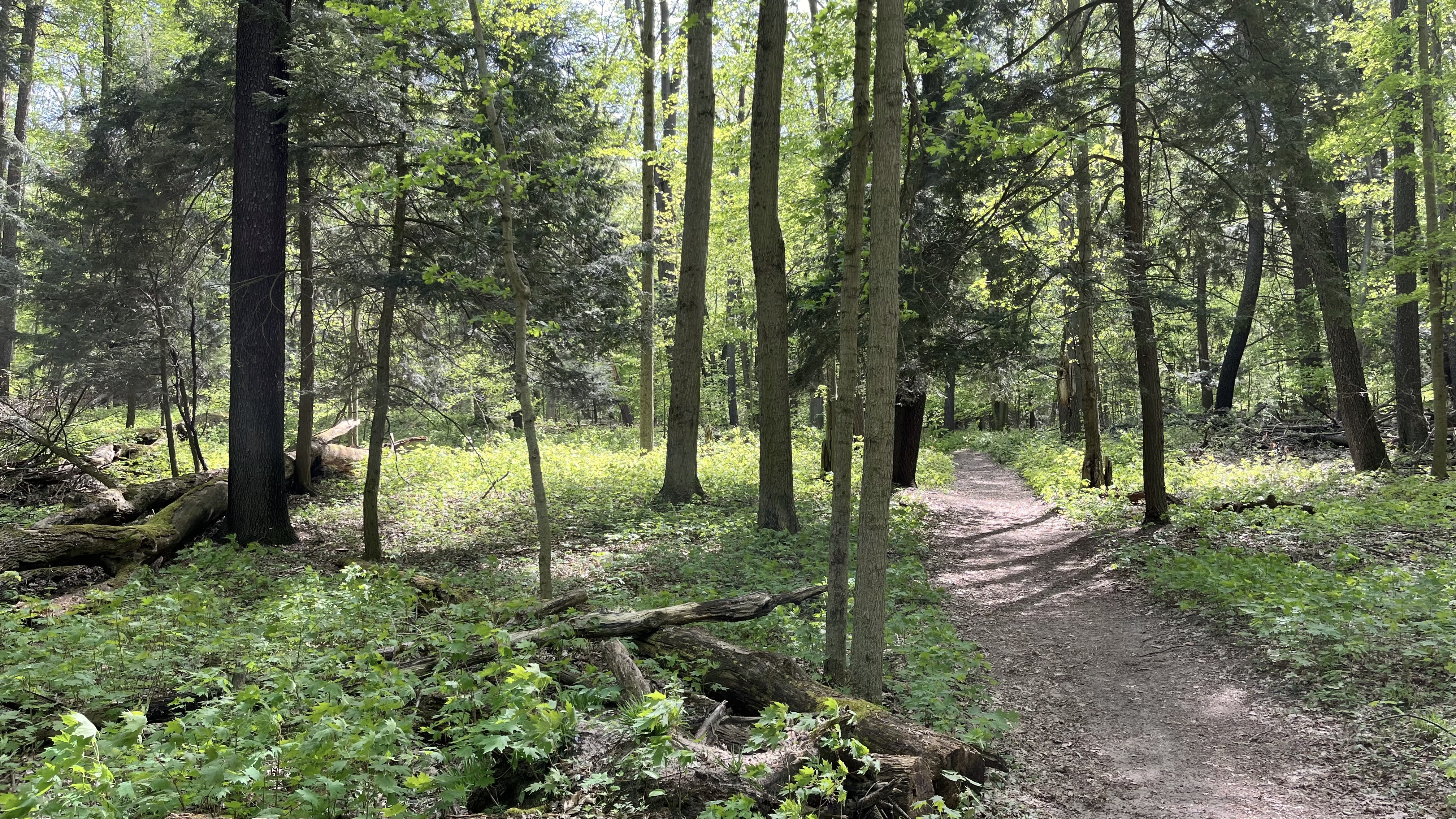 There’s a red oak tree that’s too broad to hug and a stand of white spruce shaped like a runway. Bear corn, a bubbly pine cone, hides in plain sight. Clumps of maidenstears accent the fringe of the trail.