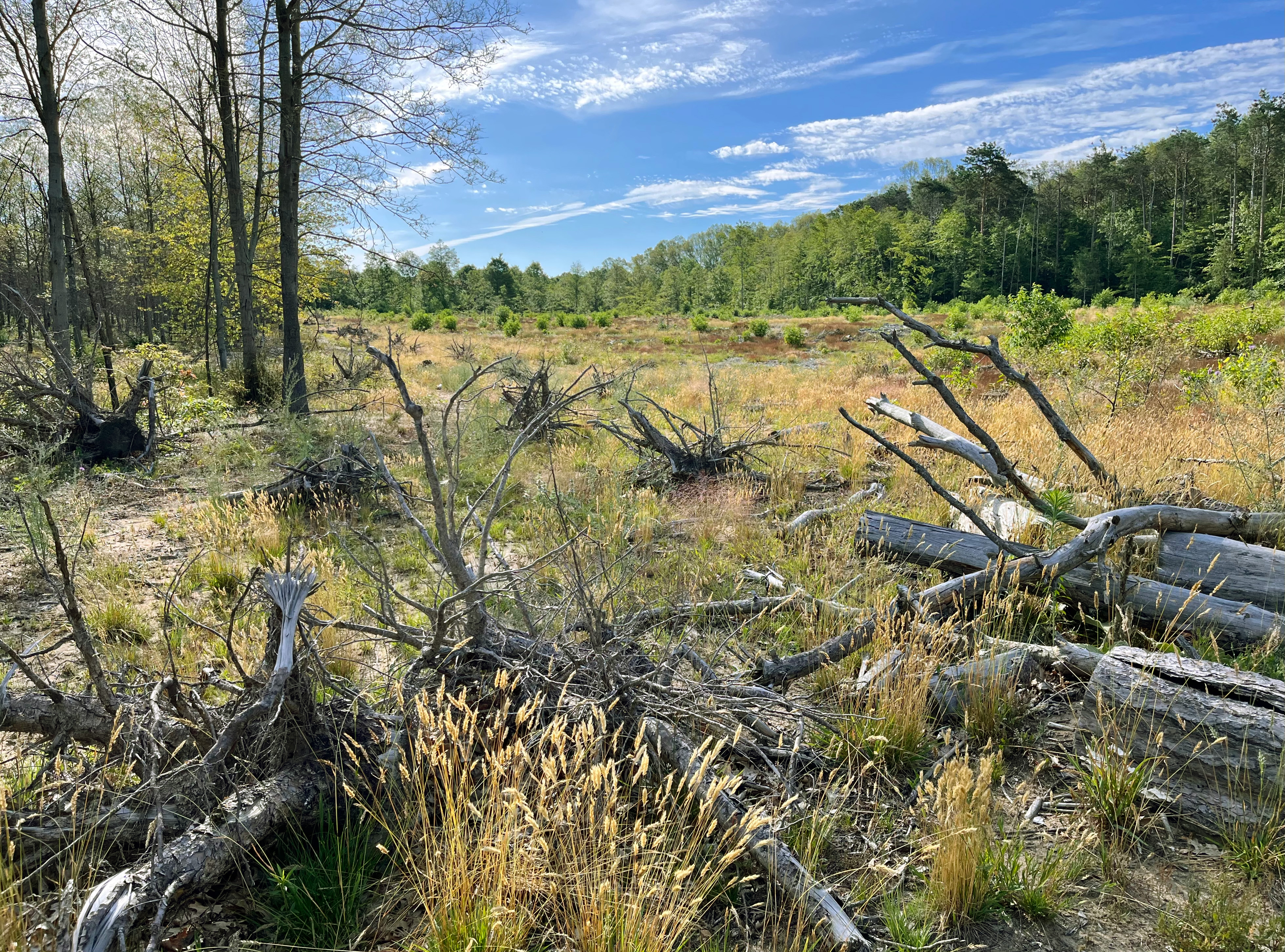 An eastern wood pewee cries from the canopy. Sandhill cranes bugle in a flattened cornfield. A red-tailed hawk soars high above the marsh. To the right, rustling leaves become a barred owl.